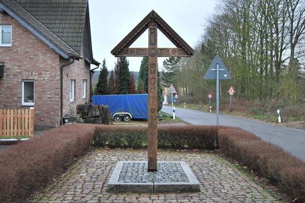 1842, im Zeichen einer neuen Ruhr-Epidemie, einer Missernte und nach der Malaria von 1840/41, wurde ein hölzernes Passionskreuz im Eingang dieses Friedhofs errichtet, seine Erneuerung aus dem Jahr 2003, eingesegnet vom örtlichen katholischen Pfarrer, steht ungefähr gegenüber. Die Schnitzereien weisen unter den Leidenswerkzeugen die 30 Silberlinge an Iudas Iskariot auf. Die Gegend um diesen Friedhof trug danach die Bezeichnung "An den 30 Silberlingen"; eventuell als Meditation, dass die Infektionskrankheiten, die das 19. Jahrhundert beherrschten, eine Bestrafung der Menschen für den Abfall vom Glauben sei. Die Arbeiter aus Mausbach, Werth und Gressenich jedenfalls mussten dieses Kreuz täglich auf dem Fußweg zu den Fabriken im Vichttal und von dort zurück nach Hause passieren. Gelegentlich wird vermutet, dass es kein unmittelbares Cholera-Kreuz und vielmehr nach seinem Standort als solches bezeichnet worden ist; ein "Pestkreuz" und Ermahnung durch die Kirche.